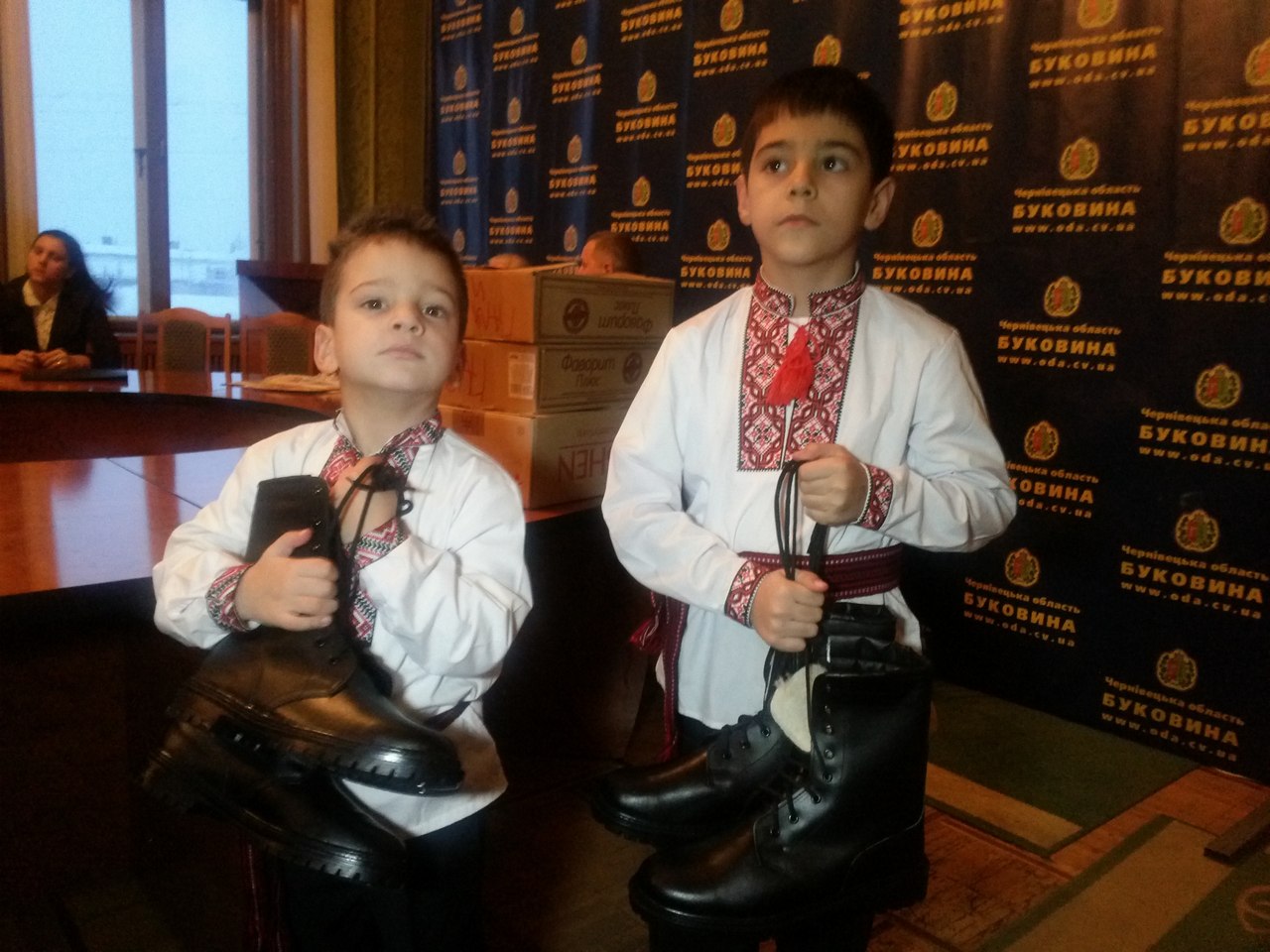 До Чернівецької ОДА сьогодні завітав дідусь з двома онуками. Хлопці спустошили свої скарбнички та придбали для наших військових подарунки до Миколая та новорічних свят – дві пари берців та солодощі.