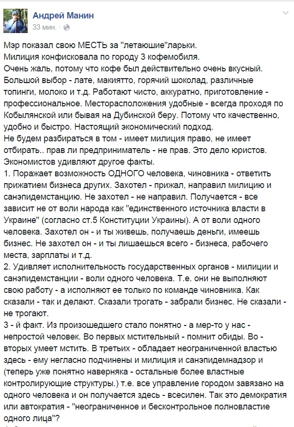 Активіст з Чернівців Андрій Манін, гостро, детально і суперечливо висловився на своїй сторінці Фейсбук про чернівецький скандал кавомобілями. скани з Фейсбук-сторінки Маніна.