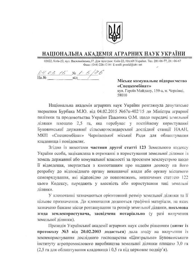 Тривала і не зовсім продуктивна за змістом моя переписка з міністерством аграрної політики та продовольства таки дала результат – 2,5 га землі, яка належить Буковинській державній сільськогосподарській дослідній станції НААН – “Спецкомбінат” може облаштувати під кладовище.