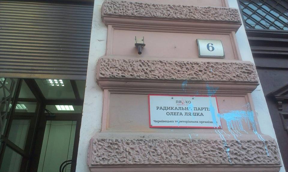 “23 березня з фасаду будівлі, в якій знаходиться офіс Чернівецької територіальної організації Радикальної Партії Олега Ляшка якісь невідомі – вандали, бо по іншому їх не назвеш, зірвали наш партійний прапор (припускаємо, що його, можливо, вирішили викрасти, щоб почепити у себе вдома))))))))). А також облили фарбою вивіску нашої партійної організації. З цього можна зробити висновок, що комусь мозолимо тут очі, або хтось вирішив вилити, в буквальному розумінні цього слова, свою неприязнь до партії. Обставини з’ясовуються та ведеться слідство”, – йдеться у повідомленні.