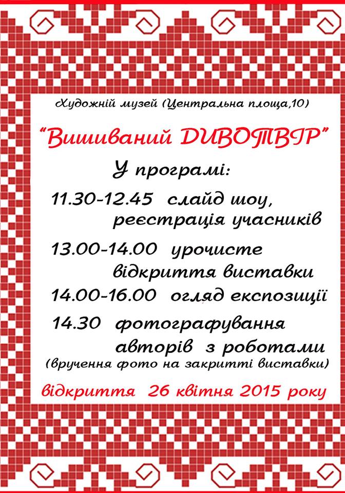 26 квітня відбудеться відкриття щорічної традиційної виставки “Вишиваний дивотвір”.