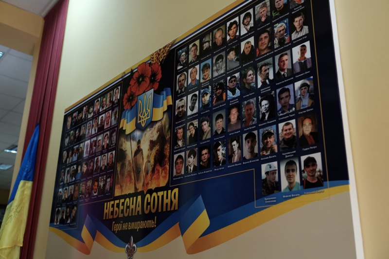 Тут представлені особисті речі учасників Майдану – каски, куртки, література про Революцію Гідності, стенди, присвячені Небесній Сотні. Про це повідомляє molbuk.ua.