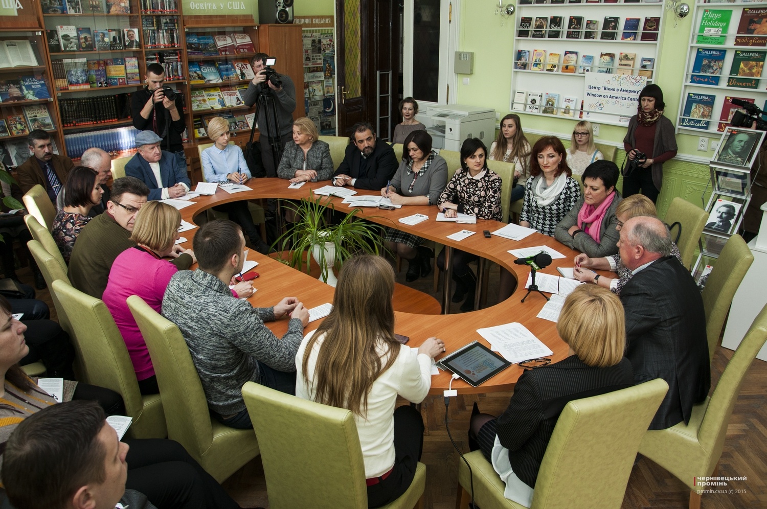 В обласній бібліотеці за круглим столом вчителі англійської пояснювали чиновникам, навіщо їм потрібна іноземна мова, а також де і як її вивчати. Адже 2016-й рік буде роком вивчення англійської мови, і її знання буде обов’язковим для чиновників. Про це пише Чернівецький промінь.Так, за словами заступниці Чернівецького міського голови Марії Порчук, в міській раді вже бракує англомовних спеціалістів, і через це багато посад досі залишаються вакантними.
