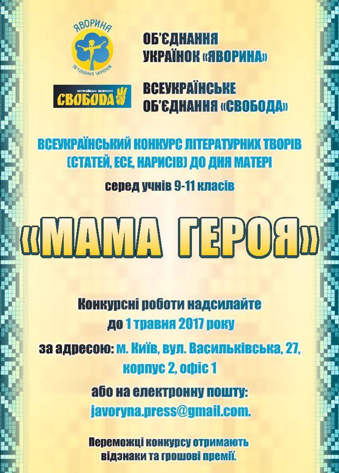 “Конкурс проводиться з 1 квітня до 1 травня. У ньому можуть брати участь учні 9-11-х класів. Приймаються учнівські твори у жанрі есе, статей, нарисів, в яких викладено історію подвигу захисника Батьківщини, значення виховання в сім’ї, думки, переживання матерів Героїв та їхня роль у формуванні характеру, вихованні захисника Батьківщини.