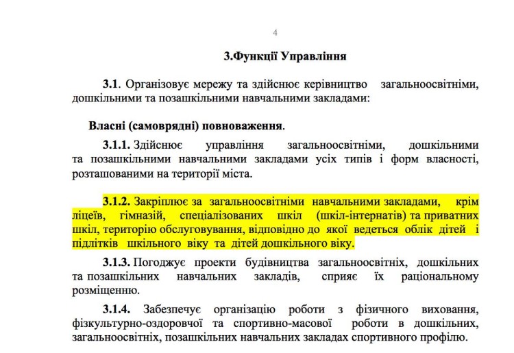 Водночас, член виконкому Андрій Рогатюк наводить перелік функцій управління освіти до яких безпосередньо відноситься закріплення за школами територій обслуговування. А про необхідність рішення виконкому не має жодного слова.