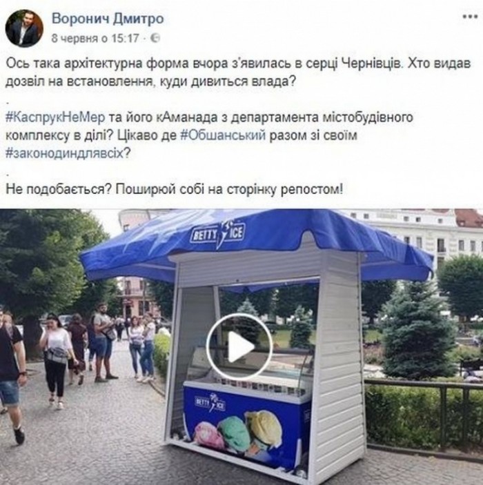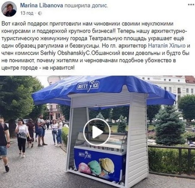 Натомість, чернівчани обурені встановленням конструкції у центрі міста. Адже кіоск з морозивом, відверто псує весь вигляд Театральної площі.