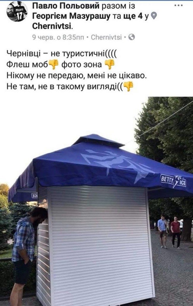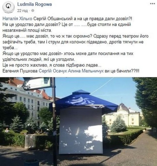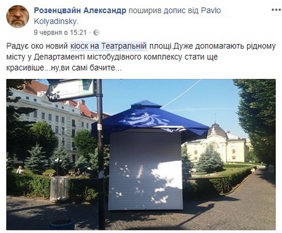 “Чернівчани, як вам новий МАФ на Театральній площі? Колись сам звертався в Департамент за дозволом на розміщення велокав’ярні на Театральній площі. Отримав категоричну відмову. “Ніяких МАФів на Театральній площі”. Часи змінились?”, – обурюється чернівчанин Pavlo Kolyadinsky.