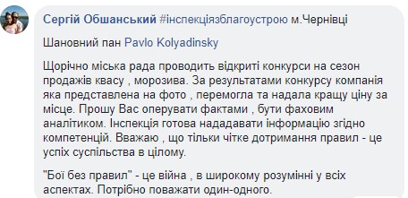 “Міська рада дала дозвіл на встановлення коску з морозивом тому, що власник надав кращу і вищу ціну за місце”, – пояснив Обшанський