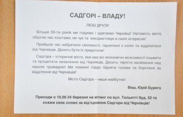 У Чернівцях розповсюджують листівки від імені депутата Чернівецької міськради Юрія Буреги із закликом до від’єднання Садгори від Чернівців. Листівки без вихідних даних розповсюджують по домівках...